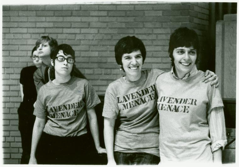 Linda Rhodes, Arlene Kisner and Ellen Broidy wearing Lavender Menace shirts at the action at the Second Congress to Unite Women.