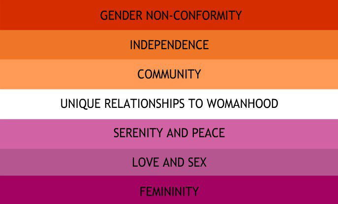 Dark orange – Gender non-conformity. Orange – Independence. Light orange – Community. White – Unique relationships to womanhood. Pink – Serenity and peace. Dusty pink – Love and sex. Dark pink – Femininity