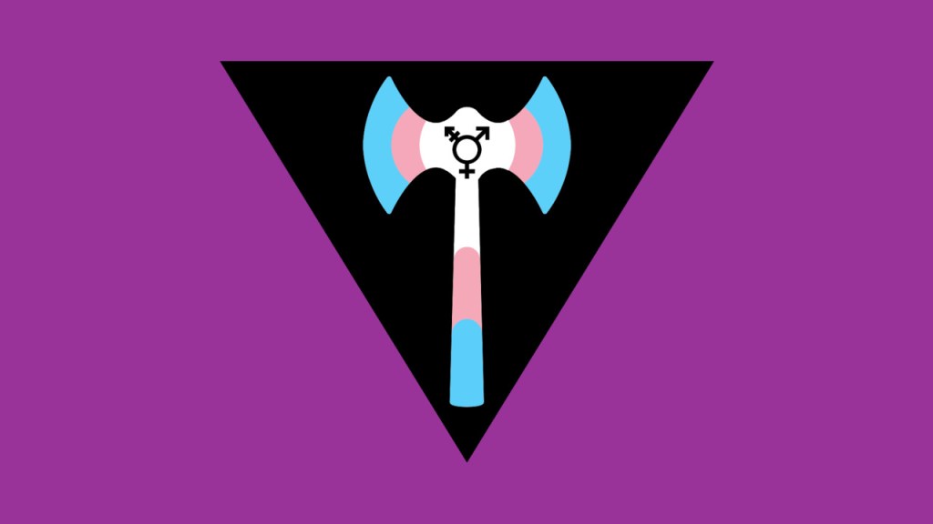 Variation of the Labrys flag featuring the trans flag colours and trans planetary symbol.